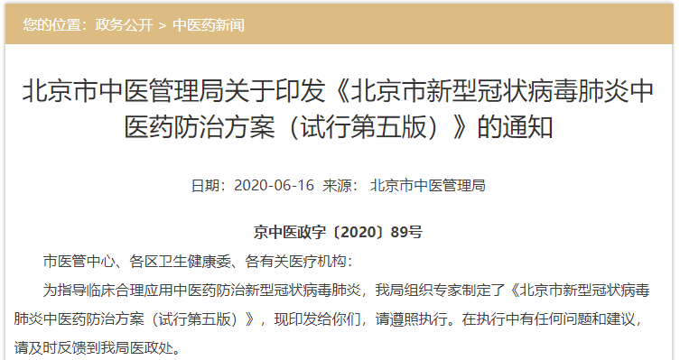 2020-07-03北京市中医管理局官网6月16日发布《北京市中医管理局关于印发<北京市新型冠状病毒肺炎中医药防治方案(试行第五版)>的通知》。